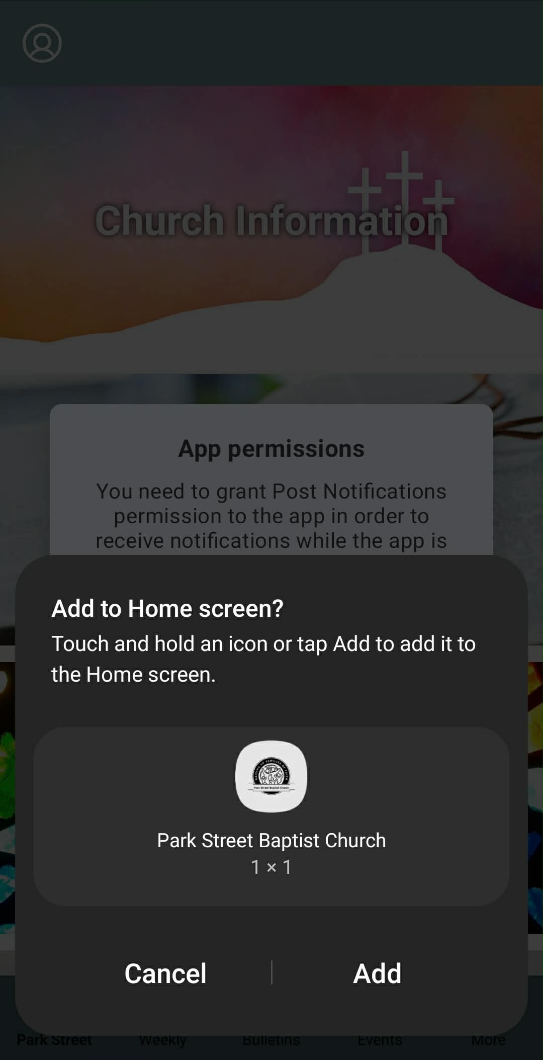 After selecting Park Street Baptist Church, the app will ask if you want to Add to Home Screen.
