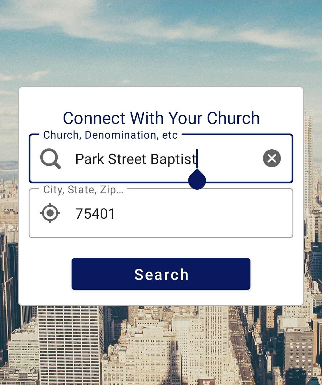 (“Park Street Baptist” also works) - In the City / State / Zip field, enter: