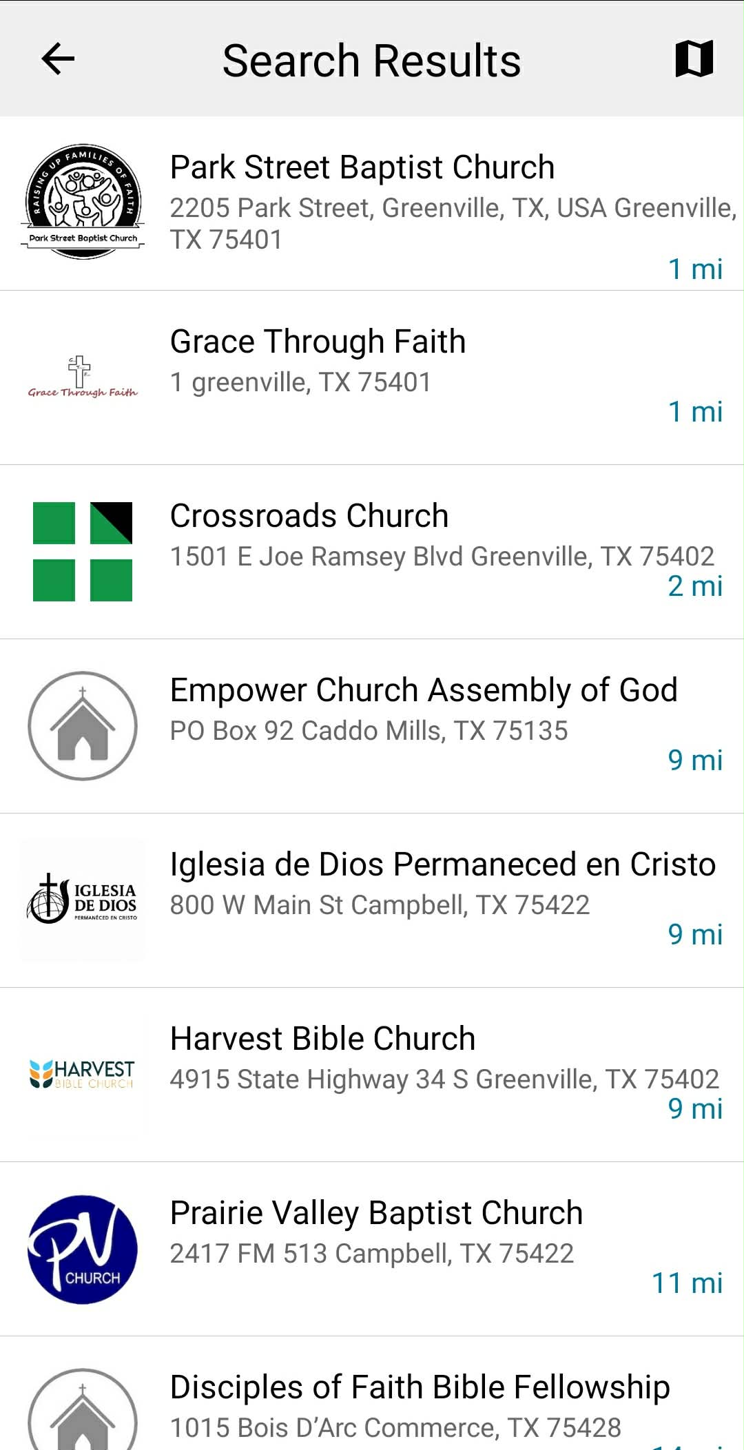 From the list, tap any church that is NOT Park Street Baptist Church.
